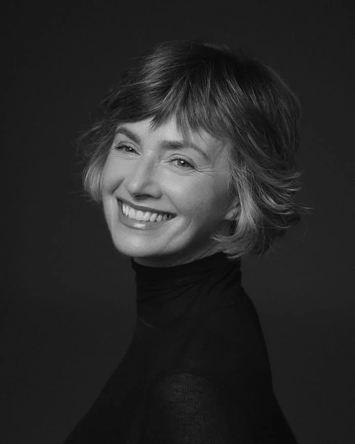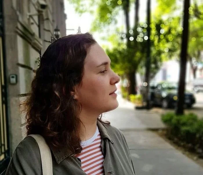 Ana con ojos cerrados disfrutando del atardecer en un parque, vestida con blusa blanca y cárdigan de encaje, tocada con pendientes grandes dorados.